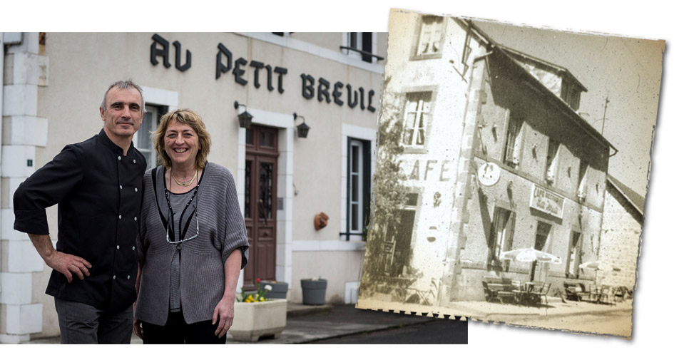 Gastvrouw Pepette en chef Alain Gourgues voor hun hotel-restaurant en daarnaast een foto uit begin jaren ‘60.