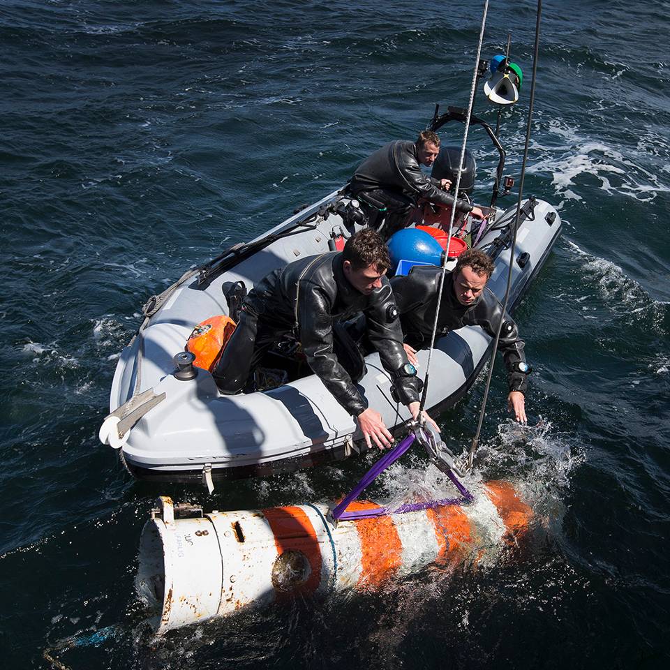 Na het oefenen is het opruimen geblazen. Duikers van de Defensie Duikgroep moesten meehelpen om oefenmijnen uit het water te halen.
