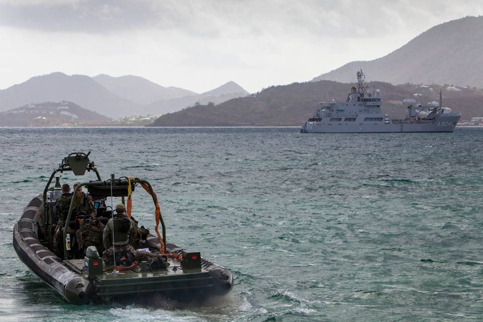 Een FRISC (Fast Raiding Interception and Special Forces Craft) rukt uit om hulp te bieden aan wal. Op de achtergrond de Zr. Ms. Pelikaan, het ondersteuningsvaartuig van de Koninklijke Marine voor het Caribisch Gebied.
