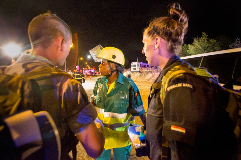 De orkaan is tijdens de HUREX 2015 niet gestopt bij landsgrenzen, maar ook niet bij de grens tussen hulporganisaties. Ambulancediensten (zie foto), maar ook politie, brandweer en Rode Kruis spelen een belangrijke rol.