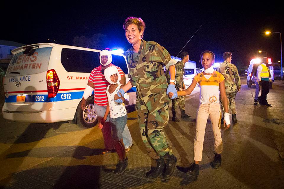 Nederlandse mariniers dragen hun gewonde Franse collega de trap af. Orkaan Zilch heeft flink huis gehouden in het gebouw waar de man schuilde. Helaas niet alleen met materiële schade tot gevolg.