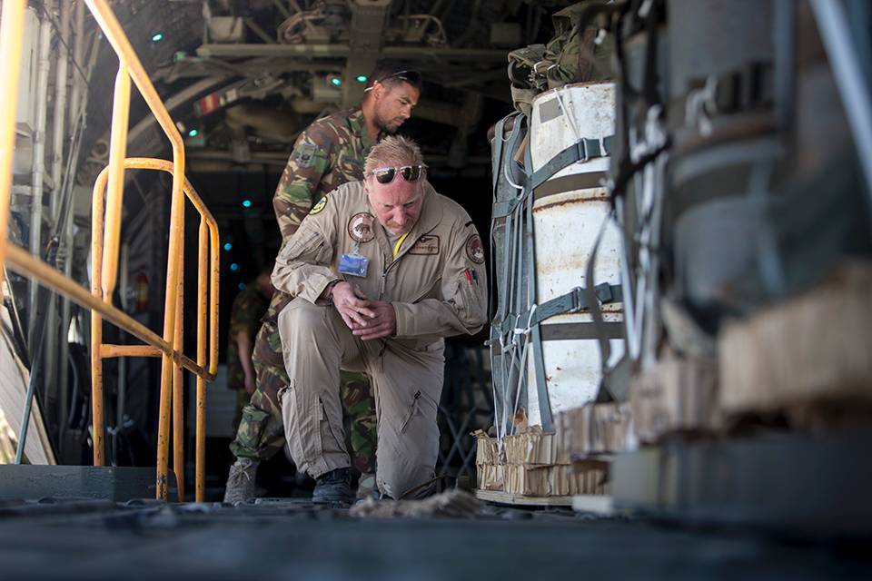 De ground liaison officer is een landmachtmilitair bij het 336 Squadron van de Koninklijke Luchtmacht. Als tussenpersoon zorgt hij ervoor dat de luchtmachters en de landmachteenheid op de grond optimaal kunnen samenwerken. Dat is zeker belangrijk wanneer een airdrop plaatsvindt onder toezicht van buitenlandse collega’s. Die hanteren vaak weer andere procedures. Portugal is wat betreft sergeant-majoor René ideaal. “In deze uitgestrekte oefengebieden kun je nog geen blind paard raken.” De ‘loadie’: Achterin de kist houdt een loadmaster de lading nauwlettend in de gaten. Een spanband en een speciale metalen goot houden de ‘stick’ – de reeks ladingen – op hun plek. Timing, daar draait het om bij een airdrop. In de laatste minuten voor de airdrop opent de loadmaster de laadklep. Pas als het groene licht aanspringt, snijdt hij de strakgespannen verankering aan. Door de spanning op de band scheurt die in 1 keer door. De pathfinder: Pathfinders van 11 Luchtmobiele Brigade vormen de ogen en oren voor de vliegers. Ze zetten de dropzone uit en zien erop toe dat die veilig is en blijft. Kort voor de drop informeren ze de vlieger over de windsnelheid en windrichting. Tot op de laatste minuut kunnen ze de airdrop afblazen, bijvoorbeeld omdat de wind te sterk aanwakkert. Sergeant-majoor Frank: “Wederzijds vertrouwen, daar gaat het om. Een vlieger gooit zijn lading alleen als wij het verantwoord vinden. Veiligheid is het allerbelangrijkste. Als een krat van 800 kilo neerkomt, is dat wel even iets anders dan een vent van 80 kilo.” De vliegers: Met hulp van de computer navigeert het vliegtuig zo precies mogelijk naar de dropzone. De vliegers houden de loadmasters achterin op de hoogte van hun positie en de aanvliegtijd. De lading mag niet te vroeg en ook niet te laat vallen. Boven de dropzone vliegt het toestel laag en langzaam, ongeveer 240 kilometer per uur. De lading: Eén voor één schuiven de ladingen uit het vrachtruim. De parachute aan de pakketten opent direct. Tijdens de training zette de Defensie Para School voor het eerst ook ‘slimme’ parachutes in. Deze vinden dankzij een gps-systeem en een computergestuurd valscherm vanaf grote hoogte zelfstandig hun weg naar het doel. Daar landen ze tot op 5 meter nauwkeurig. Ze zijn bedoeld voor de bevoorrading van speciale eenheden in vijandig gebied. De opruimploeg: De Portugezen halen de parachutes in. Ze takelen de gedropte lading op hun vrachtwagens. Terug naar de basis. Om alles weer klaar te maken voor een nieuwe airdrop.