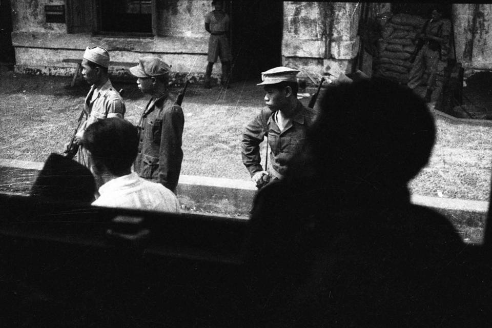 Indonesische en Nederlandse militair bij de demarcatielijn, Oost-Java, 1947