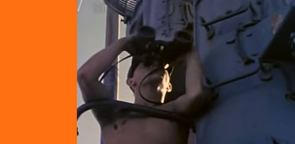 Een US Navy torpedobommenwerper, een Grumman Avenger uit WO II, vliegt over als commandant van de Nederlandse Onderzeedienst, kapitein ter zee Hugo Ammerlaan, aan boord van de USS Cod stapt. In zijn handen de Nederlandse driekleur. Aan boord van de Amerikaanse onderzeeër overhandigt hij de vlag aan de Amerikanen.