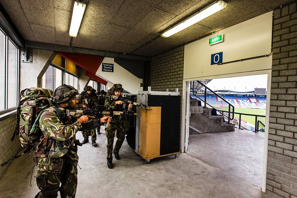Voor het markante Interpolispand in Tilburg begint de volgende opdracht. De militairen moeten 19 verdiepingen omhoog lopen om een gewonde collega op te halen. Het trappenhuis van het kantoorcomplex doet benauwd aan. “Kom op jongens, nog een paar treden”, zweept een van de soldaten zijn collega’s op. Met rood aangelopen hoofd komt de eerste groep bezweet aan. Hijgend tillen zij het dummyslachtoffer, een zandzak van 80 kilo, op hun schouders. Voorzichtig, maar toch nog met een behoorlijke snelheid begint de tocht terug. Verbaasde blikken van omstanders leiden de militairen nauwelijks af. “Het mooie van een oefening in bewoond gebied is het contact met de burgers”, aldus de commandant.