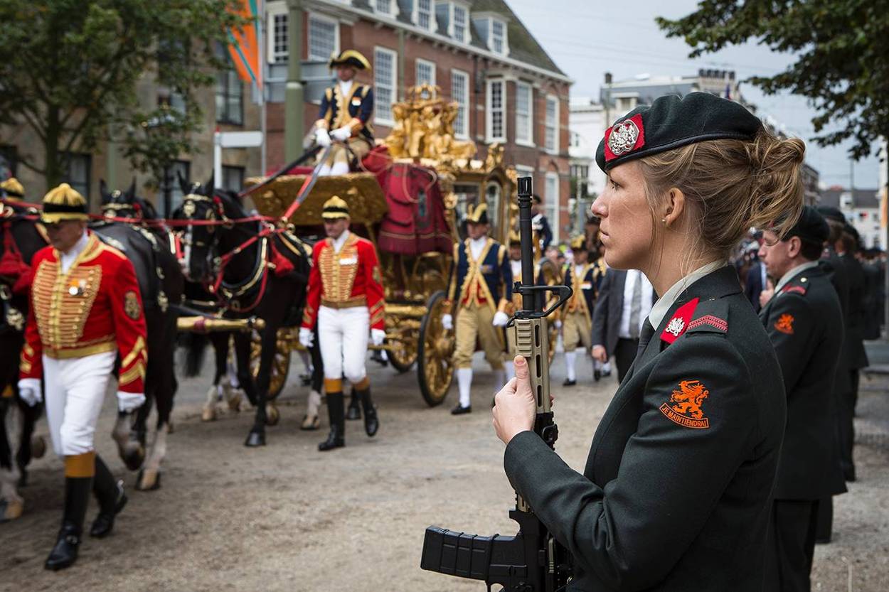 Elk krijgsmachtsonderdeel levert de nodigde manschappen voor Prinsjesdag. Zo levert de Koninklijke Marine meer dan 100 militairen voor de erewacht bij de Ridderzaal en de militaire muziek. De landmacht levert ruim 230 medewerkers voor de Koninklijke stoet, ook hier zitten muzikanten tussen. Voor de ere-afzetting langs de route worden meer dan 400 militairen geleverd. Foto: sergeant-1 Joyce Rutjes.