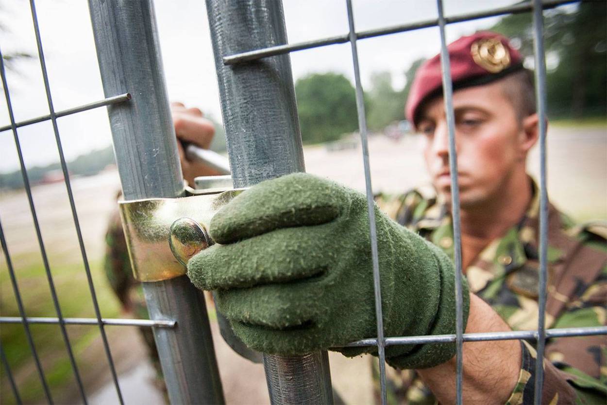 Vliegensvlug zette deze luchtmobiele infanterist een hekwerk om het bouwterrein bij Heumensoord. In het natuurgebied bij Nijmegen verrijst momenteel een asielzoekersopvang voor 3.000 mensen. De landmacht levert op verzoek van het Centraal Orgaan opvang Asielzoekers ‘handjes’. Eerder gingen militairen aan de slag in Oirschot en Weert. Defensie ondersteunt vooral met logistieke en planningsexpertise.