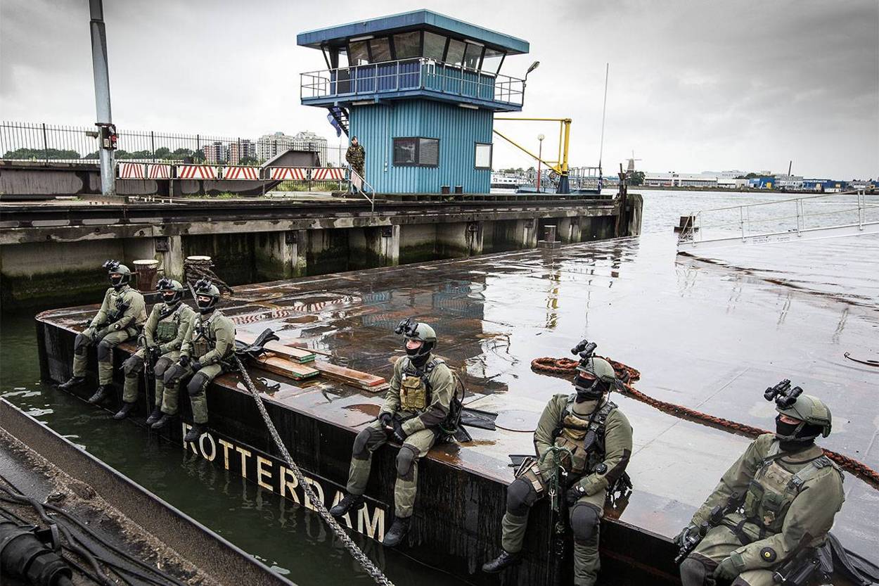 Elitemilitairen van de Maritime Special Operations Forces wachten geduldig voor ze op mogen voor de spectaculaire opening van TechBase. Tijdens dit techniekevenement van Defensie werd 2 dagen lang alles gedaan om jongeren te enthousiasmeren voor een baan als technicus bij Defensie. Locatie: de oude RDM-werf in de Rotterdamse deelgemeente Heijplaat. Ondanks de regen trok het evenement veel belangstellenden. Lees meer hierover in deze Defensiekrant.