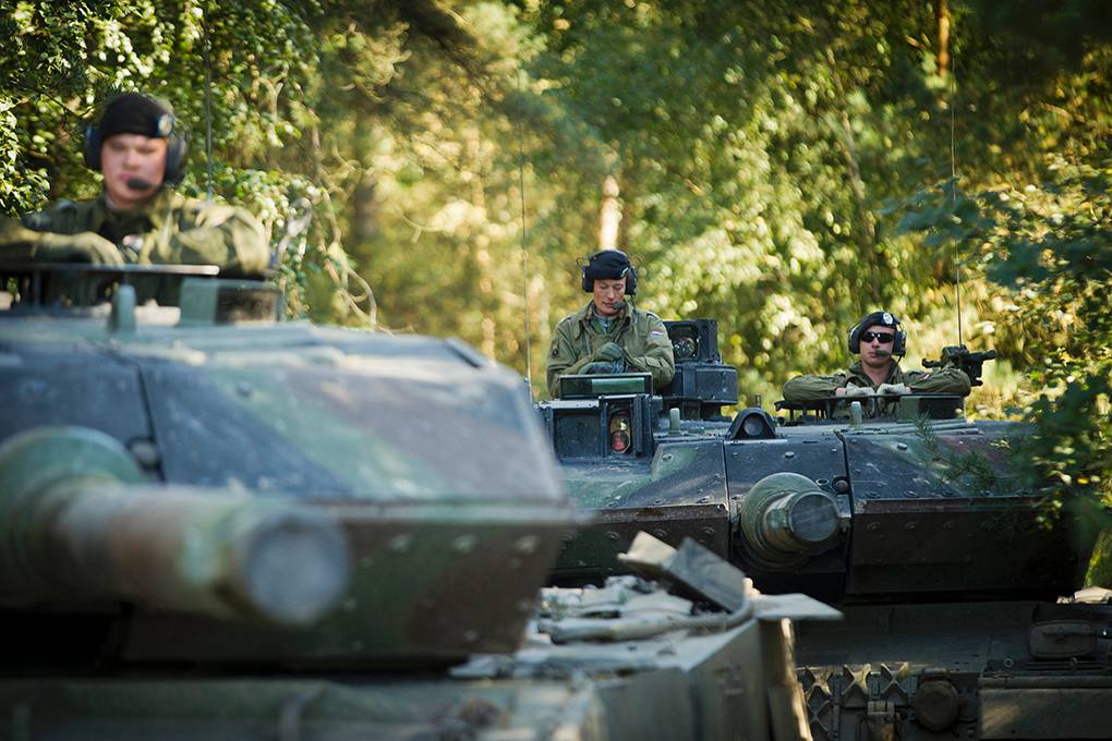 Hier rijden 2 Duitse tanks. Wie goede ogen heeft, ziet op de mouw van een van de tankbemanningen het rood-wit-blauw van de Nederlandse vlag. Het lijkt misschien een gekke combinatie. Maar straks kan Nederland weer een ‘pantservuist’ maken door intensief samen te werken met een Duitse pantserdivisie.