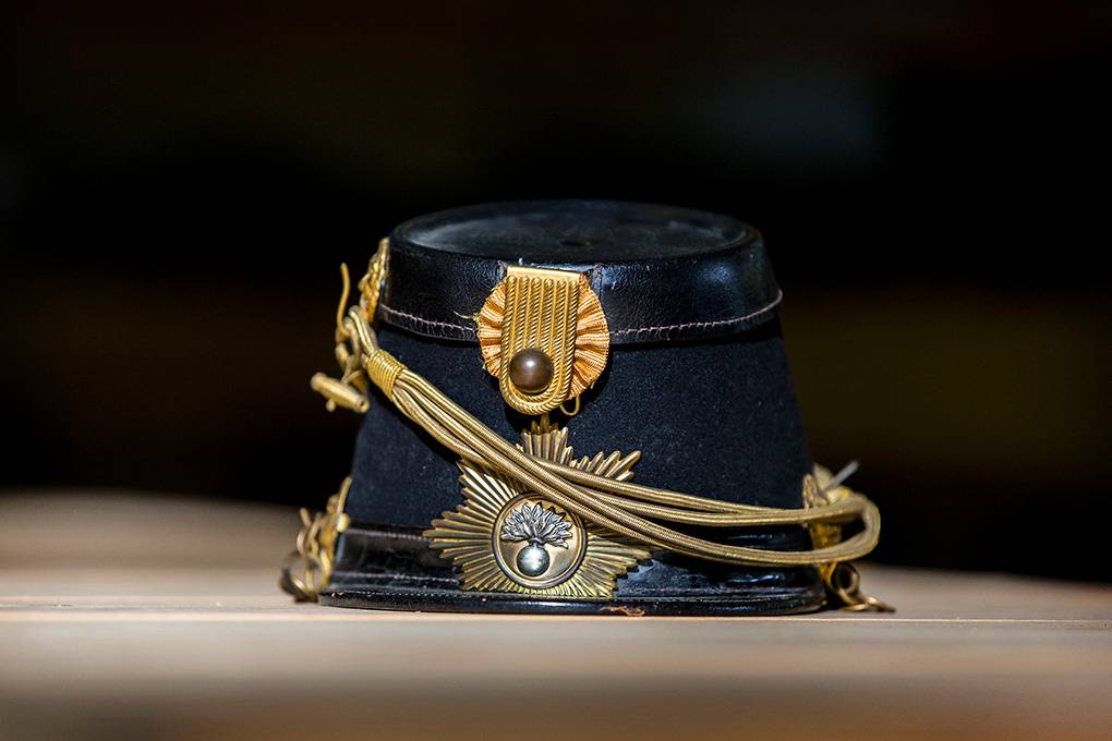Een sjako, een vilten hoed met een klep. Een van de tientallen exemplaren die het NMM afstoot. Deze is van het zogeheten ‘Model 1848’. Voorop staat het embleem of nummer van de eenheid. In dit geval is dat de springende granaat van de Garde Grenadiers, een elite-eenheid.