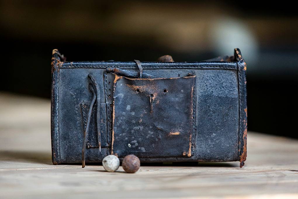 Een leren patroontas uit de Napoleontische tijd, 1813 à 1815. Elke tas bevatte zo’n 40 kogels, elk verpakt in een papieren omhulsel met daarin de kruitlading. Deze ‘manbag’ is niet in ongeschonden staat: de grote leren klep en draagband ontbreken.