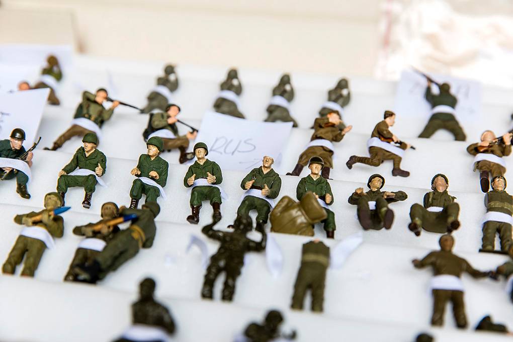 Paraat in doos: miniatuursoldaatjes. Met deze minimilitairen kunnen musea heel wat oorlogsepisodes naspelen. Plastic poppetjes maar ook troepen van tin wachten op een nieuwe eigenaar.