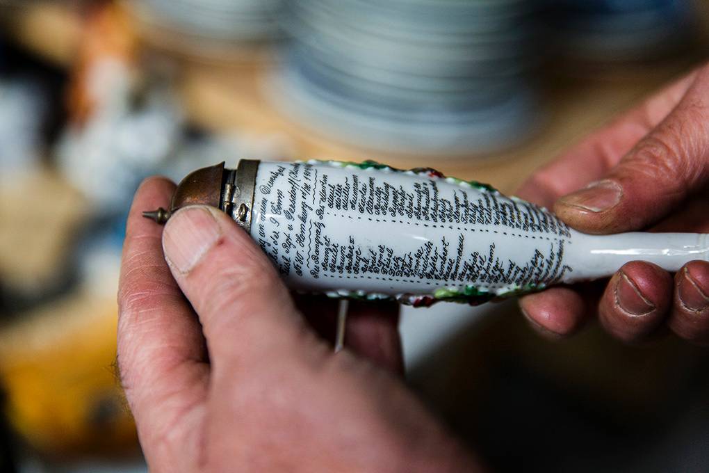 ‘Memorabilia’, heten ze in de inventaris. Souvenirs, relatiegeschenken en andere objecten waarover je soms alleen maar kunt verwonderen. Zoals dit porseleinen beeldje. Volgens een opschrift stammend uit 1937. Voor de liefhebber.