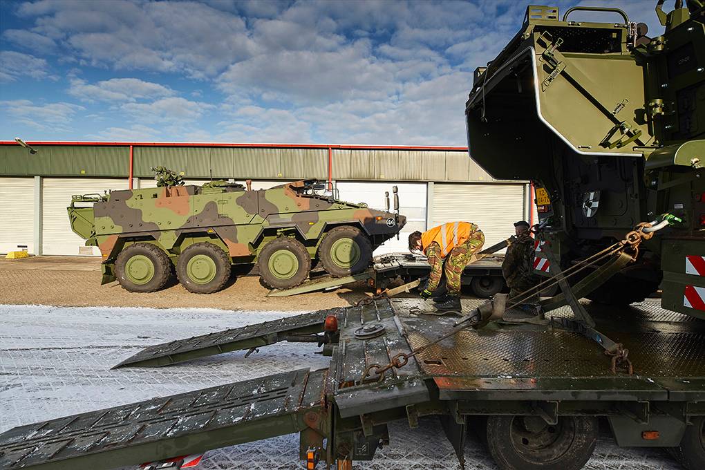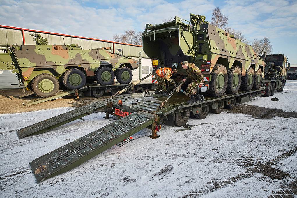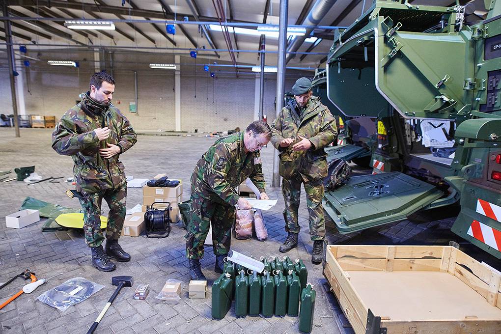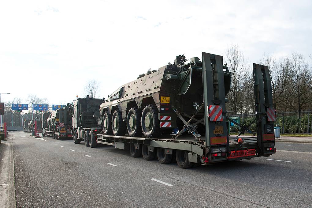 De 8-wielige zwaargewichten gaan met militaire precisie op een dieplader. Met evenveel accuratesse heeft beheerder sergeant 1 Mike van  het 17e eerder de gehele inventaris gecontroleerd die achter de gepantserde kolos ligt uitgestald. “Want”, zegt adjudant Frans Verrijt van het Instroom Begeleidingsteam (IBT): “Wij moeten ervoor zorgen dat de klant alles piekfijn in orde krijgt aangeleverd, aan de hand van een detaillijst.”