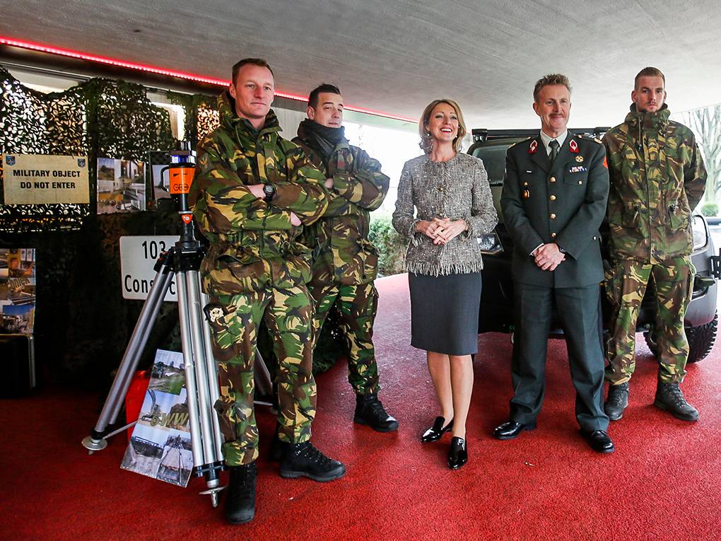 Ineke Dezentjé Hamming-Bluemink en brigadegeneraal Hans Damen tussen de genisten van 103 Contructiecompagnie.