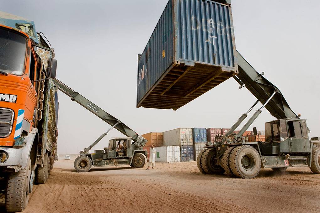 Containers met water arriveren op Kamp Holland in Tarin Kowt (Afghanistan). Transport is kwetsbaar en duur, Defensie zoekt naar nieuwe wegen. (Foto: adjudant Richard Frigge)