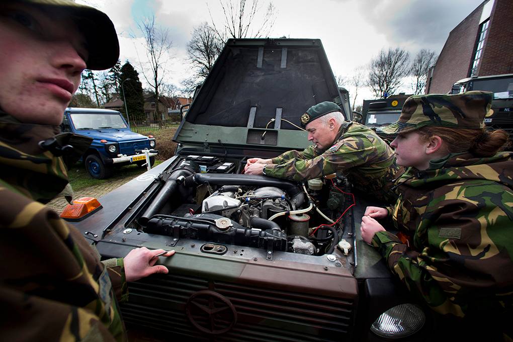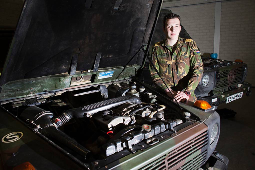 Enthousiasme kan ook leerling Tom Horn niet worden ontzegd. Elke dag, 2 keer daags zit hij anderhalf uur in de trein om op Landstede de Niveau-3 opleiding te volgen: de toegang tot de onderofficiersopleiding. “Ik wil van kleins af al bij Defensie”, legt hij uit. “Werken bij de berging, dat lijkt me mooi. Je moet creatief zijn om het telkens maar weer te fixen voor je collega’s.”
