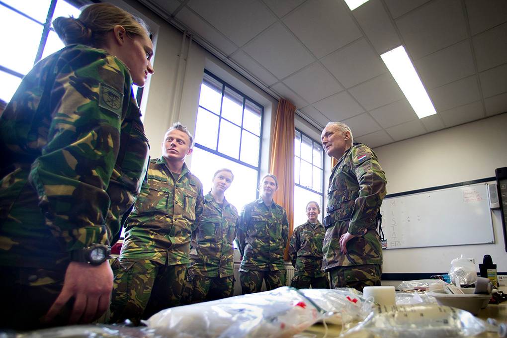 Mede daarom willen de VeVa-leerlingen in de richting Zorg graag meer ‘groene’ stages. Op dat punt kan de generaal deze potentiële militaire verzorgenden en verpleegkundigen geen toezegging doen. “Je kunt niet zomaar iemand laten meedraaien in een ziekenhuis”, geeft hij aan. “Jullie moeten het medische vak eerst in de vingers hebben, voordat je het als militair gaat toepassen.” Dat de militaire instructeurs van de VeVa vaker reguliere zorglessen van een militair tintje voorzien, ziet Middendorp als een mooie middenweg. Op uitzending kun je immers ook worden geconfronteerd met ouderenzorg of psychiatrie. De militaire docenten kunnen hun uitzendervaring inzetten om de leerlingen bij de les te houden.