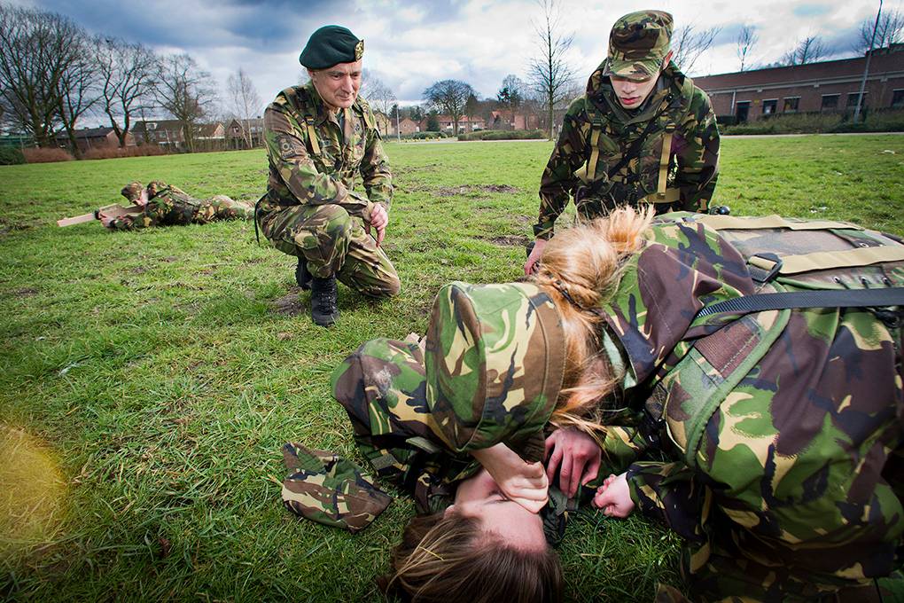 Een militair verpleegkundige en een VeVa-leerling behandelen de ‘gewonde’.