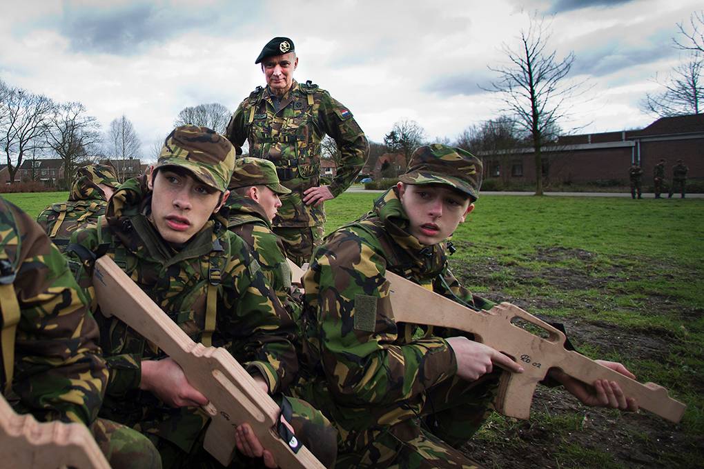 Ze dragen een vlekkenpak, praten in afkortingen en spreken elkaar aan met de achternaam. En ze lopen rond met houten geweren. De leerlingen Veiligheid en Vakmanschap, kortweg VeVa, vormen de voorhoede van een nieuwe generatie manschappen en onderofficieren bij de krijgsmacht. Vorige week kregen ze op ROC Landstede in Harderwijk bezoek van de Commandant der Strijdkrachten, generaal Tom Middendorp.