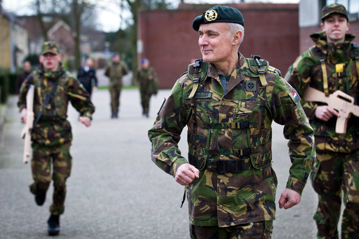 Een zweem van zweet waart rond in de kantine van Landstede. Je kunt het de VeVa-leerlingen moeilijk kwalijk nemen. Want wanneer mag je nou Nederlands hoogste militair ontvangen op je school? “Übervet”, vindt Tjerk van Eckeveld het bezoek van de viersterrengeneraal. De eerstejaarsleerling GROP, oftewel Grondoptreden, droomt van een baan als infanterist. Maar voor hem kan het vandaag al niet meer stuk. “Ik heb het pak eigenlijk nog niet verdiend, maar ik ben heel trots dat ik het mag dragen. En nu zeker.” Generaal Middendorp loopt de hele middag namelijk mee met een peloton ‘Groppers’. Vooraf instrueert laatstejaars Ralph Bultmans zijn team. Hun patrouille voert langs de verschillende VeVa-opleidingen van Landstede.