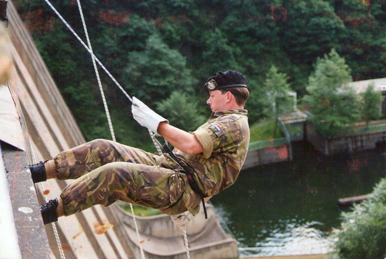 Godding in 1995 als opperwachtmeester-instructeur bij 42 tankbataljon in het Duitse Vogelsang. Het abseilen gebeurde in het kader van een grensverleggende activiteit.