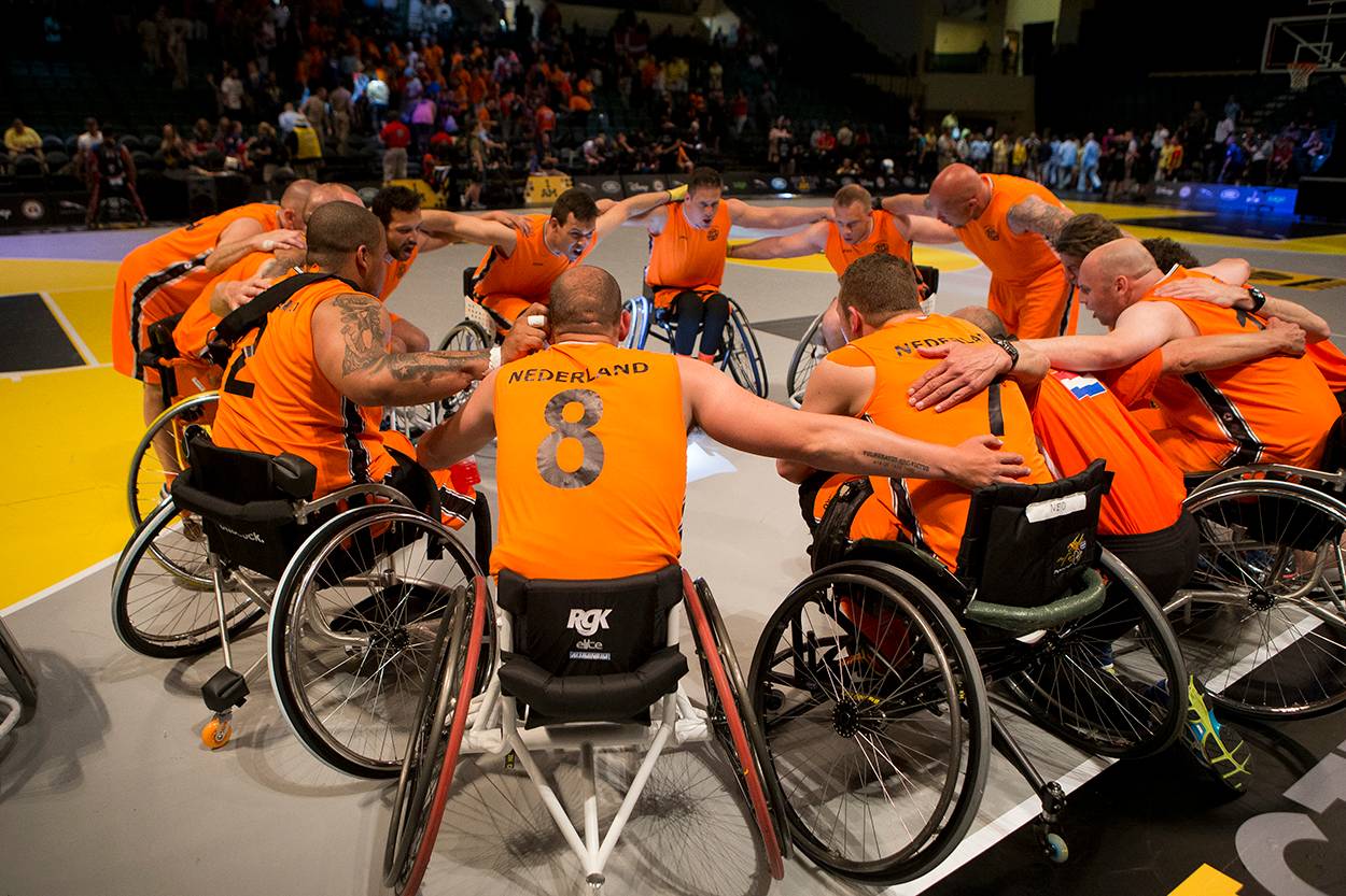 Het HP Field House op het immense ESPN Wide World of Sports-complex is de plek waar de prijzen worden verdeeld. Een arena omzoomd door toeschouwers, gevuld met stampende beats. Uit de rook doemen de matadoren op. Grootmachten Groot-Brittannië en de Verenigde Staten treffen elkaar in de strijd om goud, Nederland en Denemarken knokken om brons. Voor de debutanten van Oranje is hun plek in de troostfinale een prestatie op zich. Maar op de laatste dag van de Invictus Games willen ze meer.