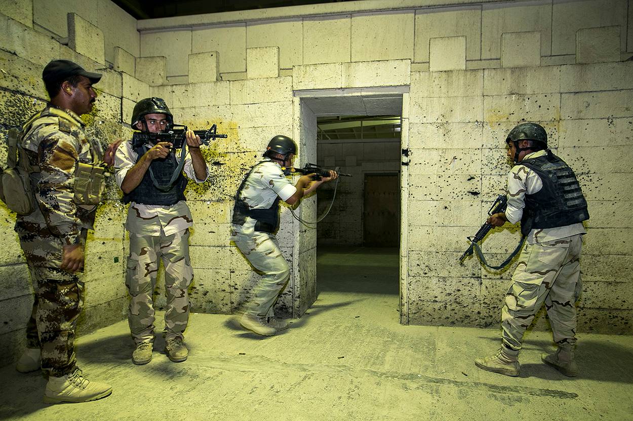 Close Quarter Battle (te vergelijken met wat we in Nederland ‘Optreden Verstedelijkt Gebied’ noemen, red.) is een onderdeel van de commandocursus dat de Irakezen als zeer waardevol ervaren. Hier geeft een Iraakse instructeur – getraind door Task Force 631 – uitleg over hoe op te treden in een schiethuis. Nadat zijn cursisten het pand hebben verkend, verlaten ze het object, plaatsen ze hun met scherpe munitie gevulde magazijnen en vallen nogmaals binnen. Korporaal der eerste klasse Erwin plaatst zijn oordoppen en schreeuwt: “Ik houd toezicht en evalueer achteraf de les met de instructeur. Maar ik zie nu al dat ze hier echt heel goed in zijn. Het gaat gesmeerd! Wij zijn trouwens echt jaloers op dit schiethuis en trainen er zelf ook als we tijd hebben.”