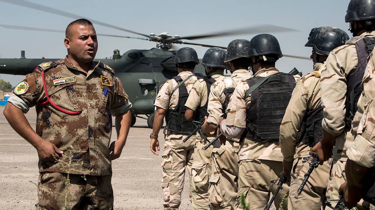 Met behulp van Mi-17 transporthelikopters van het 15e Squadron ‘The Night Wolves’ traint het 4e Iraakse commandopeloton van de Counter Terrorism Services Academy in- en uitstijgen tijdens helikopteroperaties. Na de grondtraining vliegen de cursisten aan het eind van de ochtend daadwerkelijk een aantal rondjes in de ‘Black Beauty’. Het stemt pelotonscommandant majoor Kudaer (links op de foto) tevreden: “Dankzij deze oefening groeit het vertrouwen van mijn studenten en kunnen ze in de toekomst goed getraind de lucht in. Ze weten nu wat de juiste procedures zijn, hoe ze moeten gaan zitten en hoe ze in zo’n kist hun wapen moeten vasthouden.”