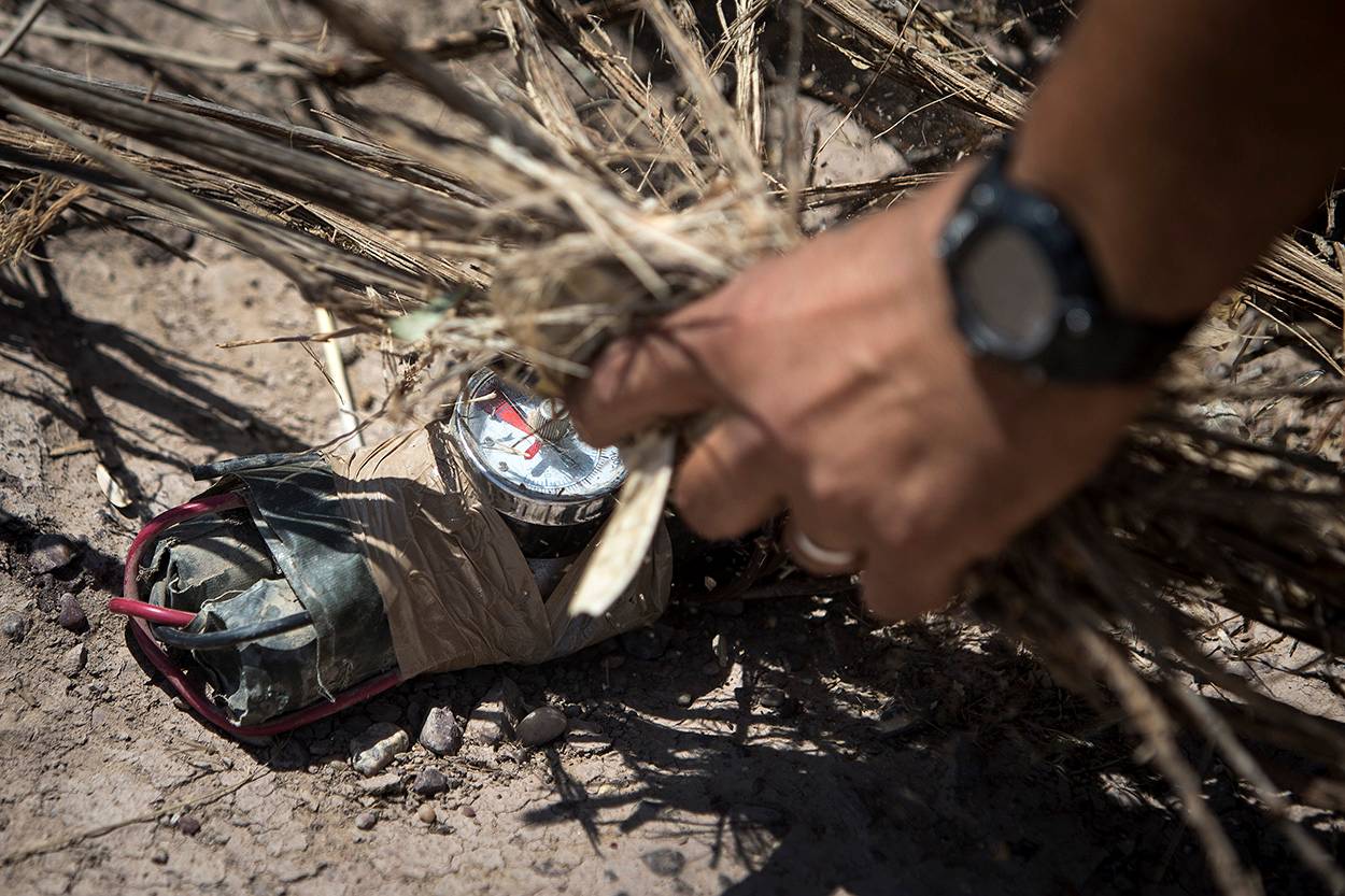 Tijdens de oefenscenario’s maakt de coalitie veelvuldig gebruik van improvised explosive devices. ISIS gebruikt ze namelijk ook veelvuldig. De bom op de foto wordt weggelegd op het pad naar een buitenhuis – inclusief zwembad – op het terrein van Al Radwaniyah Presidential Complex. Vroeger was het een luxueuze locatie inclusief vijvers, dierentuin en pompeuze paleizen waar Saddam Hoessein bijkwam van de dagelijkse beslommeringen. Nu leidt operatie Inherent Resolve er commando’s en instructeurs op. Korporaal Hans: “Perfecte plek. Alles wat we de commando’s bijbrengen, kunnen we hier in de praktijk uitvoeren. Vooral het inpandige werk en het zuiveren van gebouwen.”
