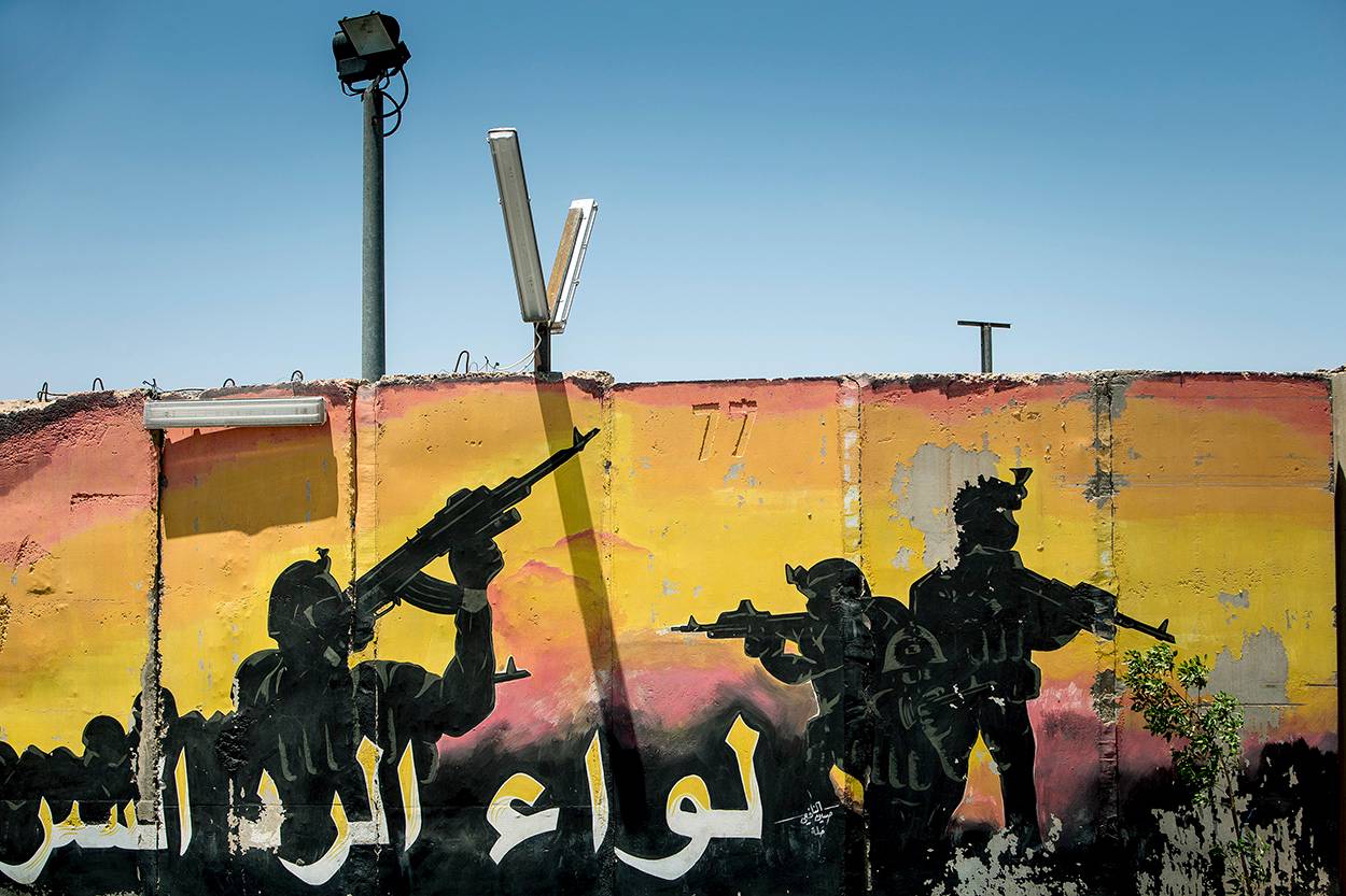 Een van de vele muurschilderingen die te vinden zijn rondom het kampement van waaruit de coalitie opereert. België is een van de landen waarmee Nederland in Bagdad nauw samenwerkt. In een krappe bunker (het alarm is net afgegaan, red.) vertelt de Belgische militair Kris: “Onze beiden staven werken hier in 1 ruimte en we slapen allemaal in dezelfde ‘straat’. En als je naar de cursussen kijkt, zie je dat wij er enkele draaien met Nederlandse ondersteuning en vice versa. Dat gaat gemakkelijk, omdat wij dezelfde taal en cultuur hebben. En omdat de landen naast elkaar liggen, kunnen wij soms iets meesturen met een Nederlands vliegtuig of omgekeerd. Wij zijn allebei spelers op het internationale Special Operations Forces-vlak, echter beperkt in aantal. Als wij iets geloofwaardigs op poten willen zetten, moeten we wel samenwerken.”