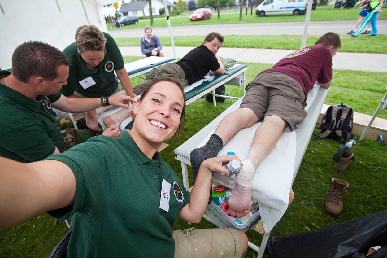 Bij een blaar volgt vanzelf de eeuwige vraag: doorprikken of negeren? Het woord is aan kapitein-luitenant ter zee Ernst-Paul van Etten, marine-arts en al tien jaar betrokken bij de Vierdaagse: “Doorprikken, ontsmetten en dakpansgewijs intapen.  Op die manier bouw je een soort tweede huidlaag die het beschadigde deel beschermt tegen frictie.”