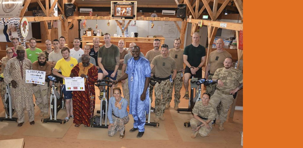 In plaats van het gepruttel van koffiemachines en het geluid van ping-pong balletjes, klonk er vorige week gezoem en gehijg in 'De Uitlaat' op Kamp Castor. Een team van 31 Nederlandse, Duitse en Belgische militairen in Mali spinden in het weekend 1.560 euro bij elkaar voor goede doelen in Gao. Gezamenlijk hielden zij op Kamp Castor een etmaal lang 4 fietsen in beweging.