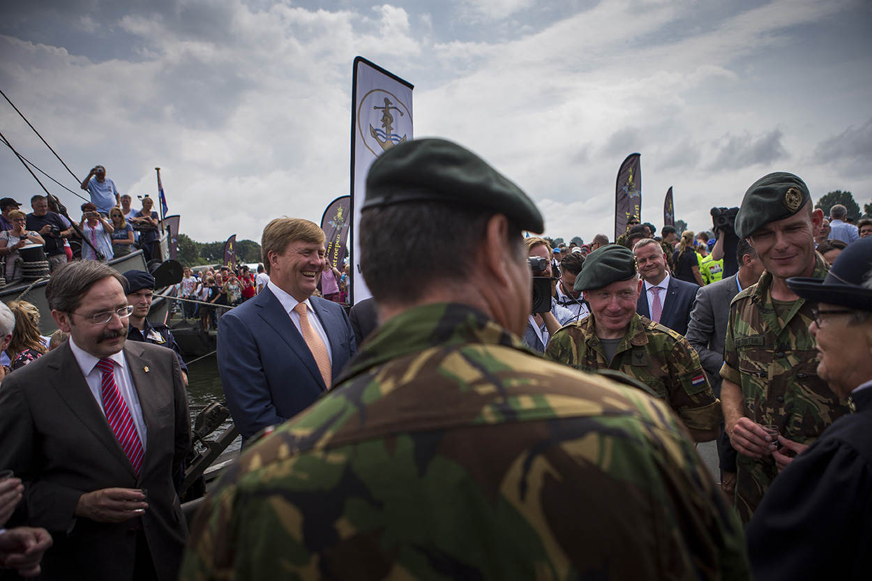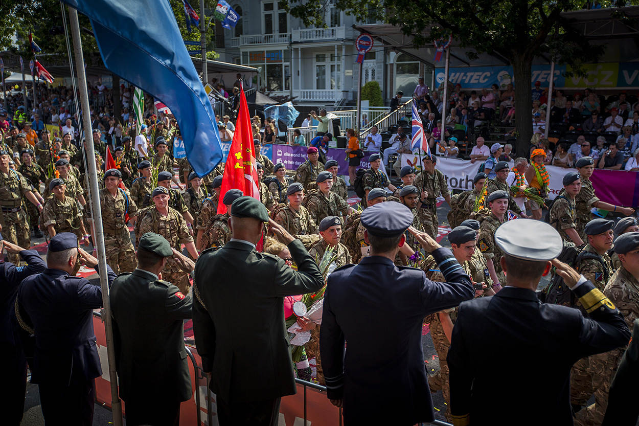 De jubileumeditie kreeg een koninklijk tintje, dankzij een bezoek van koning Willem-Alexander. Hij ging onder meer bij genisten van 105 Geniecompagnie Waterbouw langs die een vouwbrug over de Maas had aangelegd tussen Cuijk en Mook. De koning kreeg uitleg over de militaire overspanning, luisterde naar het regimentslied en werd getrakteerd op het traditionele glaasje brandewijn. Militairen uit landen als Frankrijk, Duitsland, Zweden en Noorwegen vertrekken ’s ochtends in alle vroegte vanuit het militaire kamp Heumensoord. Dat ligt midden in het bos bij Nijmegen en bestaat uit een grote eettent, een feesttent, een uitgebreide medische post en veel grote slaaptenten. Onderweg vinden allerlei leuke initiatieven plaats om iedereen een onvergetelijke dag te bezorgen. Zo verrast de Duitse Reservisten Gruppe Süd bewoners van verpleeghuis Veste Brakkenstein in Nijmegen met een ballade. Veel kinderen reageren enthousiast op de voorbijlopende militairen en geven hen maar al te graag een ‘high five’. De Zwitserse delegatie wordt enthousiast welkom geheten op Heumensoord door hun eigen meegebrachte promotie- en welkomstcomité. De Zwitserse lopers zijn net onder de bijzondere poort doorgelopen bij de ingang van het kamp, met de enorme legerhelm en -kisten. De legerkisten waarop, als het even kan, alle deelnemers bij vertrek 'afkloppen' voor een goede afloop. Militairen van 13 Herstelcompagnie uit Oirschot zijn onderweg naar Beuningen. Tijdens de 100ste Vierdaagse vieren ze ook hun eigen jubileum: het 65-jarig bestaan van hun compagnie. Kapitein der mariniers Theo van Kaathoven probeert zijn team na binnenkomst in de feesttent op Heumensoord te belonen met een snoepje of ontbijtkoek. Ze trappen er niet in en kiezen voor een biertje. Milicien Juan Martijn uit Aruba wordt langs de kant voor zijn eerste blaar behandeld door een collega. Veel wandelaars hebben een eigen medische kit bij zich voor noodgevallen onderweg. De fanatieke miliciens van de Arubaanse Militie lopen de Vierdaagse in hun vakantie. Op Groesbeek Canadian War Cemetery herdenken Canadese militairen collega’s die gesneuveld zijn tijdens de Tweede Wereldoorlog. "Naast het uitlopen van de Vierdaagse is deze herinneringsbijeenkomst het belangrijkste evenement voor ons”, zegt een van de Canadese militairen. Luitenant-ter-zee (A) 2OC Caroline Hellendoorn en majoor Tonnie Dulk inspecteren de passerende eenheden op correct tenue voor de uitreiking van het felbegeerde Vierdaagsevaantje. Vlak na het dorp Plasmolen passeert een detachement van het Korps Nationale Reserve uit Amersfoort. Voor sommige militairen is het lastig om te bepalen of het tropenhoedje of de baret op moet. “Jullie maken er wel een petje van”, grapt een militair die wordt gecorrigeerd omdat hij op het verkeerde moment een tropenhoed droeg. Op de derde dag is het voor de wandelaars ook weer heerlijk om natgespoten te worden. Brand- en tuinslangen, steigers met sproei-installaties, tuinsproei-automaten, cementkuipen met water (waar de hond ook rustig uit meedronk), ballonnen en alles waar water in zit of uitkomt, brengt enige verkoeling, wat de loop- en feestvreugde verder verhoogt. De Amerikaanse luitenant-kolonel Green loopt voor de 9e en laatste keer de Vierdaagse. Binnenkort gaat hij met pensioen en wordt hij leraar scheikunde. Hij zal alle 'meer dan vriendelijke' Nederlanders missen. Vooral die keer toen hij helemaal stuk ging en zelfs een vrouw van 85 aanbood om z'n rugzak te dragen. “Als zij het aandurft, dan moet ik het ook kunnen”; die gedachte hield hem op de been. Voor de 3e achtereenvolgende keer won 11 Bevoorradingscompagnie van 11 Luchtmobiele Brigade het Vierdaagsevaantje van de landmacht als meest representatieve detachement. De eenheid scoorde hoge ogen vanwege de 'wow-factor', aldus plaatsvervangend Commandant Landstrijdkrachten generaal-majoor Martin Wijnen. Hij reikte de prijs uit aan de detachementscommandant, majoor Nol van de Wiel. Op de 4e en laatste dag begroeten hoge officieren van de krijgsmachtdelen ('saluting officers') de militairen op de St. Annastraat in Nijmegen, die zoals altijd bij het slotakkoord van de Vierdaagse is omgedoopt tot Via Gladiola. Vol trots lopen de militairen met hun gladiolen en zeker 160 kilometer in de benen over de overwinningsstraat. De vele omstanders ontvangen de helden vol enthousiasme.