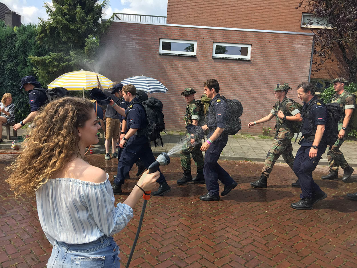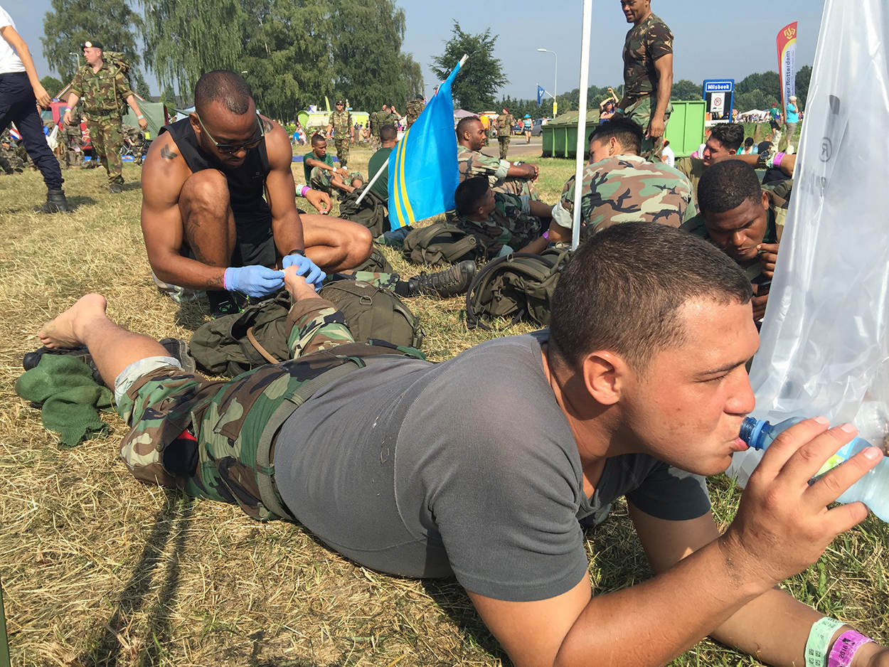 Draag een pet, smeer je goed in tegen de brandende zon en – het allerbelangrijkste - drink voldoende water. Enkele tips van de organisatie voor de lopers van de jongste Nijmeegse Vierdaagse. Want het was warm. Op sommige dagen was het zelfs tropisch warm, met temperaturen van boven de 30 graden Celsius. Om de militairen en burgers zo veel mogelijk bij te staan waren er extra waterpunten ingericht en mochten lopers van de 30 en 40 kilometer een half uur eerder starten.