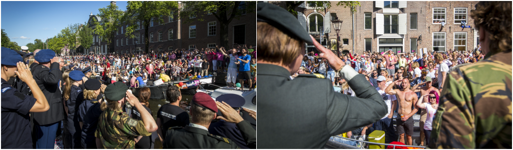 Ondanks dat er nog een hoop te winnen valt, is de Nederlandse krijgsmacht wereldwijd het verst op het gebied van LHBTI-emancipatie. Enkele jaren geleden adviseerde de SHK zelfs op verzoek de Amerikaanse krijgsmacht over de sociale en juridische omgang met LHBTI-personeel. Kort daarop schafte de grootmacht haar ‘don’t ask, don’t tell’-beleid af en richtte het LHBTI-netwerk OutServe op. Een aantal leden daarvan voer afgelopen zaterdag mee over de Amsterdamse grachten.