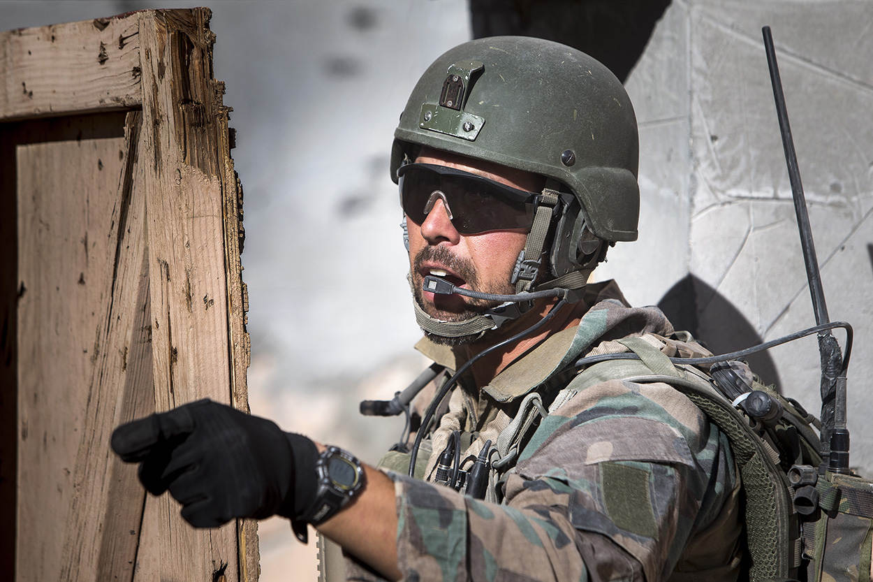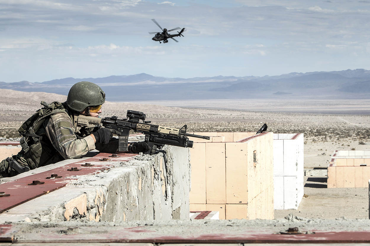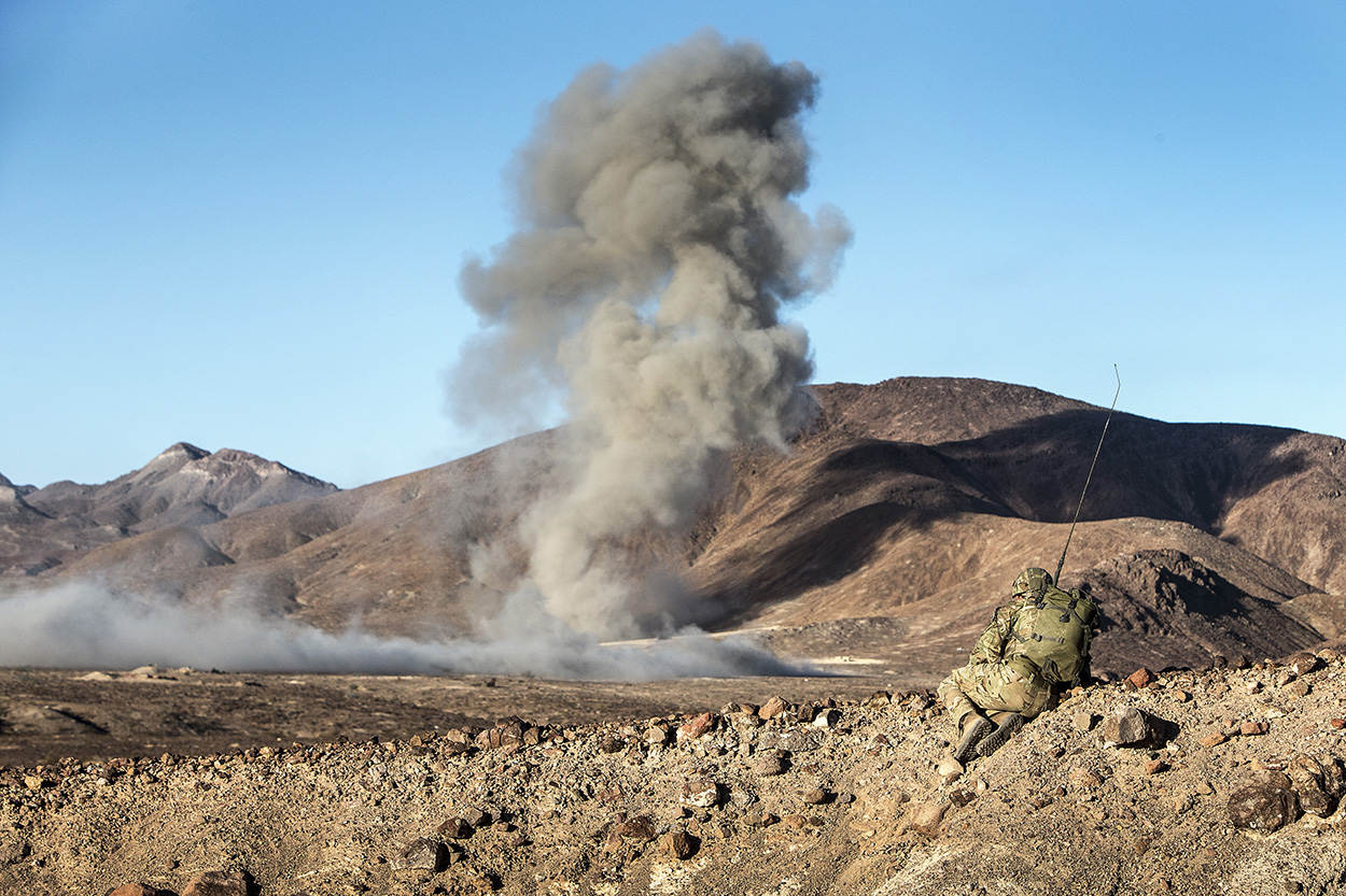 In de States is alles groter. Immens is dan ook het woord dat het oefenterrein in Californië het beste beschrijft. Uitgestrekte vlaktes vol zand, rotsen en tanige struikjes. Her en der, ingeklemd tussen bergketens, zijn oefendorpen gebouwd. Eenheden kunnen hier met alles wat een leger in huis heeft, oefenen. “In Europa hebben we simpelweg niets vergelijkbaars”, zegt trainingsofficier kapitein Simon Long van 40 Commando. “Alleen hier kunnen we volledig geïntegreerd oefenen.”