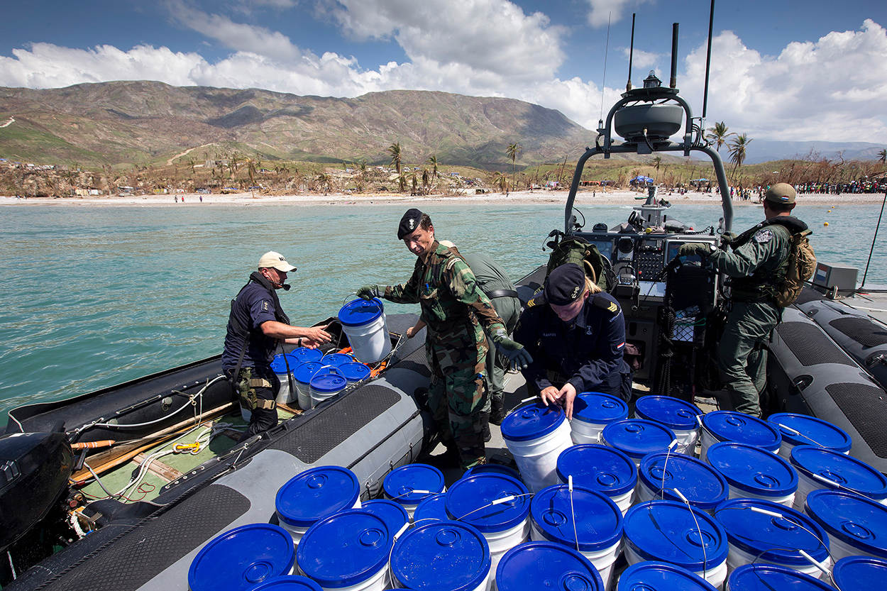 Nederlandse militairen hebben water en voeding uitgedeeld. Verder was er na de orkaan op sommige plekken 80 tot 90 procent van de huizen vernield. Familietenten van het Rode Kruis en shelterboxen, met daarin een tent en andere huishoudelijke spulletjes, bieden dan uitkomst.