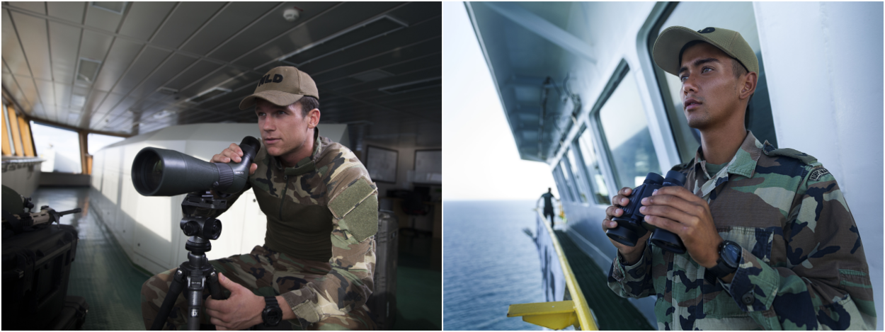 “We hebben 2 skiffjes bij ons; over stuurboord”, observeert de derde stuurman. Marinier Auke loopt richting de rechter brugvleugel. Met zijn verrekijker onderzoekt hij de bootjes. “De rechter heeft 2 man aan boord. Links zie ik 6 personen.”