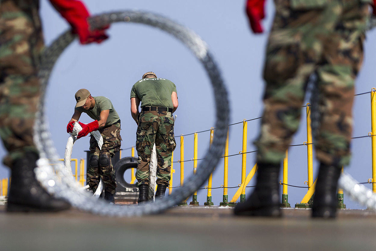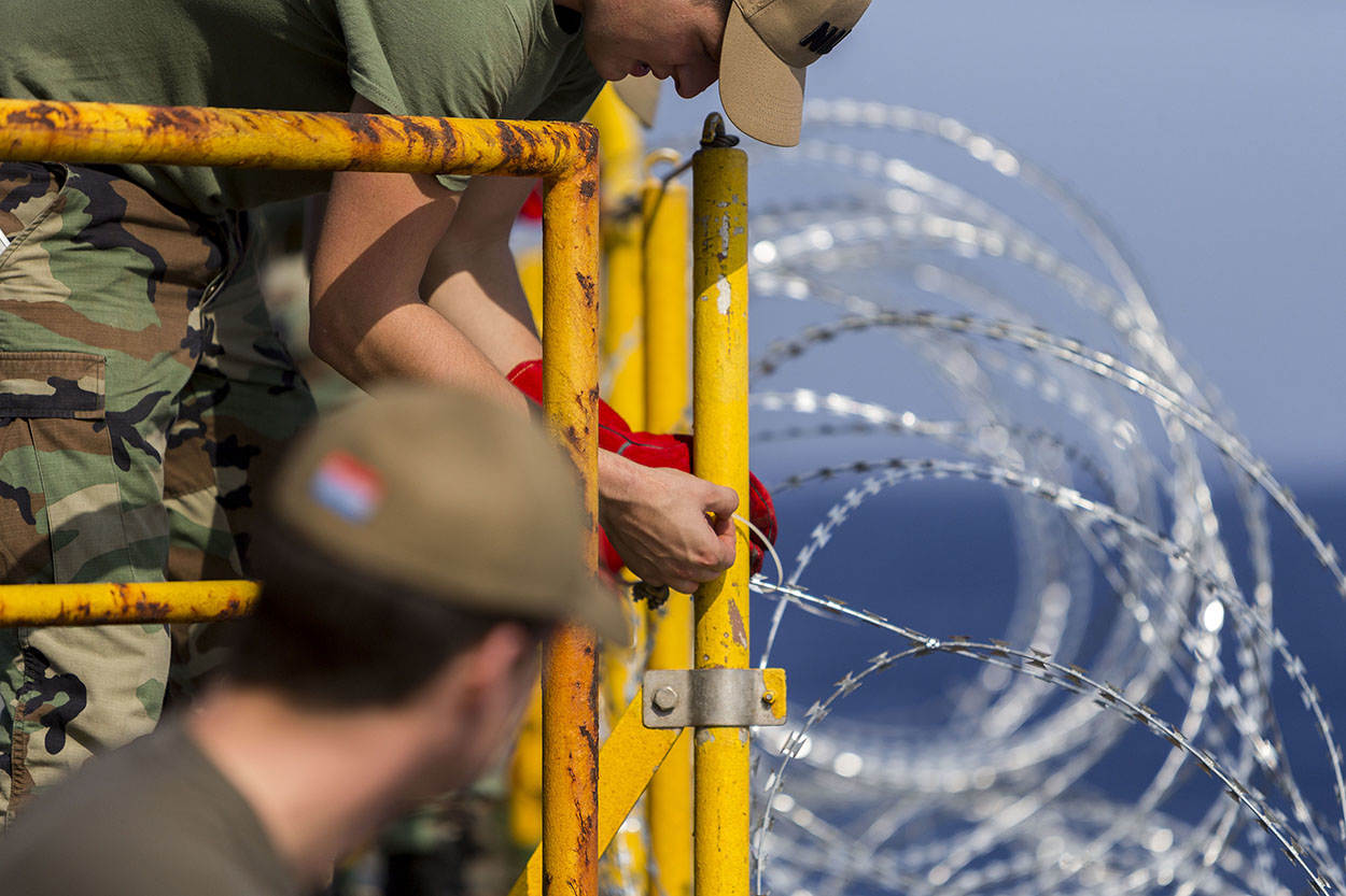 Als eerste brengen de mariniers concertina’s aan. Dit staaldraad heeft uitsteeksels die veel weg hebben van scheermesjes. Hierdoor is het voor piraten vrijwel onmogelijk zonder verwondingen aan boord te komen.