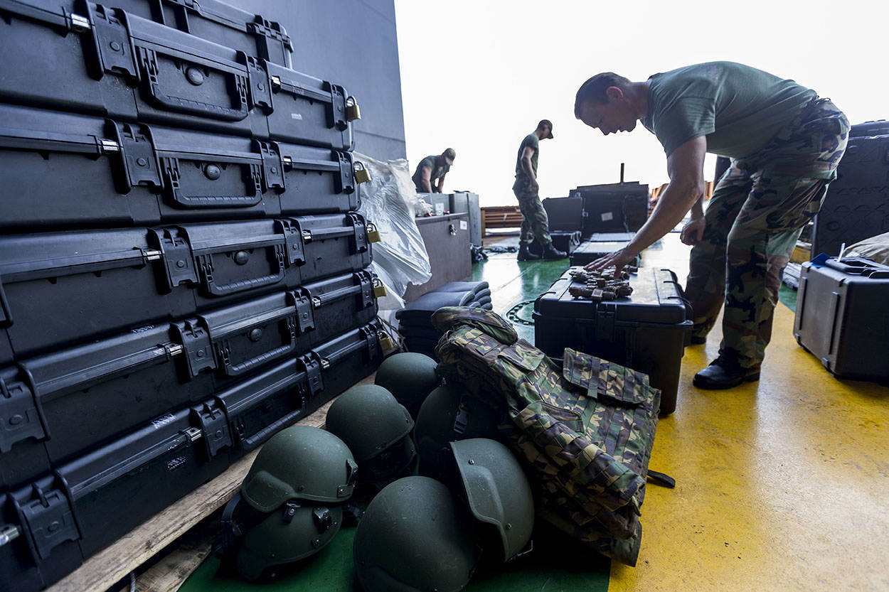 In 12 boxpallets hebben de mariniers alles bij zich om hun taak uit te voeren. Van helmen en kogelwerende vesten, tot wapens en medische benodigdheden.