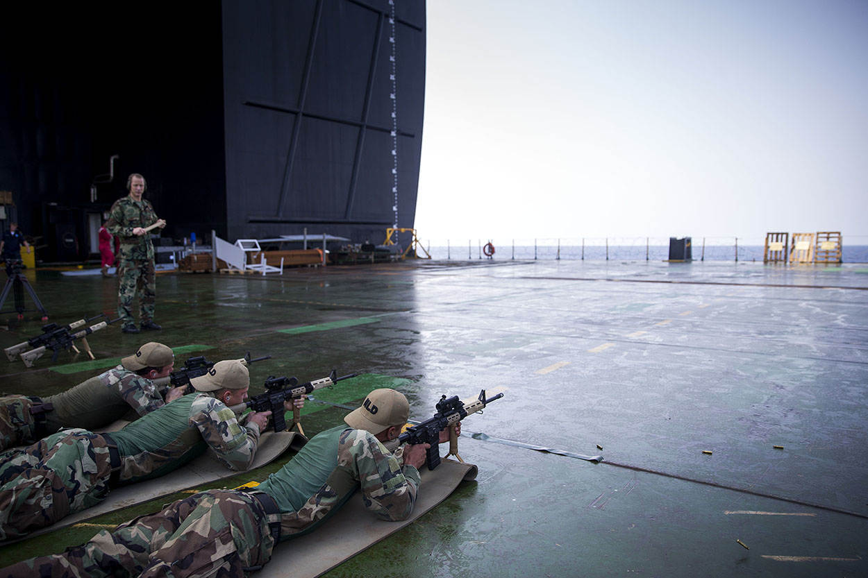 En natuurlijk moet ook de MAG ingeschoten worden. Loopt het wapen niet vast en is de loop nog in orde? Als ook dit is afgerond, zijn de mariniers klaar voor de High Risk Area.