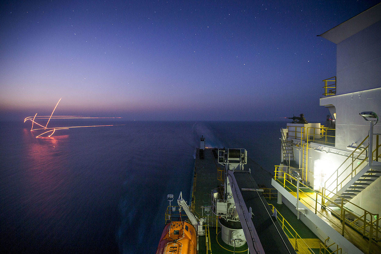 Zeker als halverwege de reis, rond Djibouti, de twee skiffs aan bakboord opduiken. Marinier Auke beweegt zich rustig naar de MAG aan het uiteinde van de brugvleugel. De kap die het wapen bedekt, schuift hij naar voren zodat de kolf zichtbaar wordt. “Ik wilde ze duidelijk maken dat wij het schip beschermen en bewapend zijn”, vertelt Auke. Naarmate het schip dichter bij de skiffs komt, tekenen de boeien van een visnet zich af. Vals alarm.