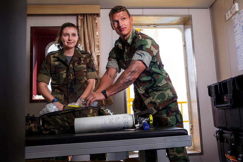 Mocht een militair gewond raken, dan sleept de Combat Life Saver, marinier Stefano, hem naar een veilige locatie. Vervolgens is het aan korporaal Iris om de eerste levensreddende handelingen uit te voeren en de gewonde te stabiliseren.