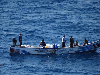 Een aantal dagen eerder, voor de Red Zed II het risicogebied binnen gaat, spreekt luitenant Jeffrey zijn mannen toe: “Een skiff wordt vooral gebruikt door vissers, maar ook piraten varen ermee. Hebben ze klimgereedschap, olievaten of een grote hoeveelheid mensen aan boord dan zou het om piraten kunnen gaan. Ook dubbele motoren en een flink aantal wapens is kenmerkend.”