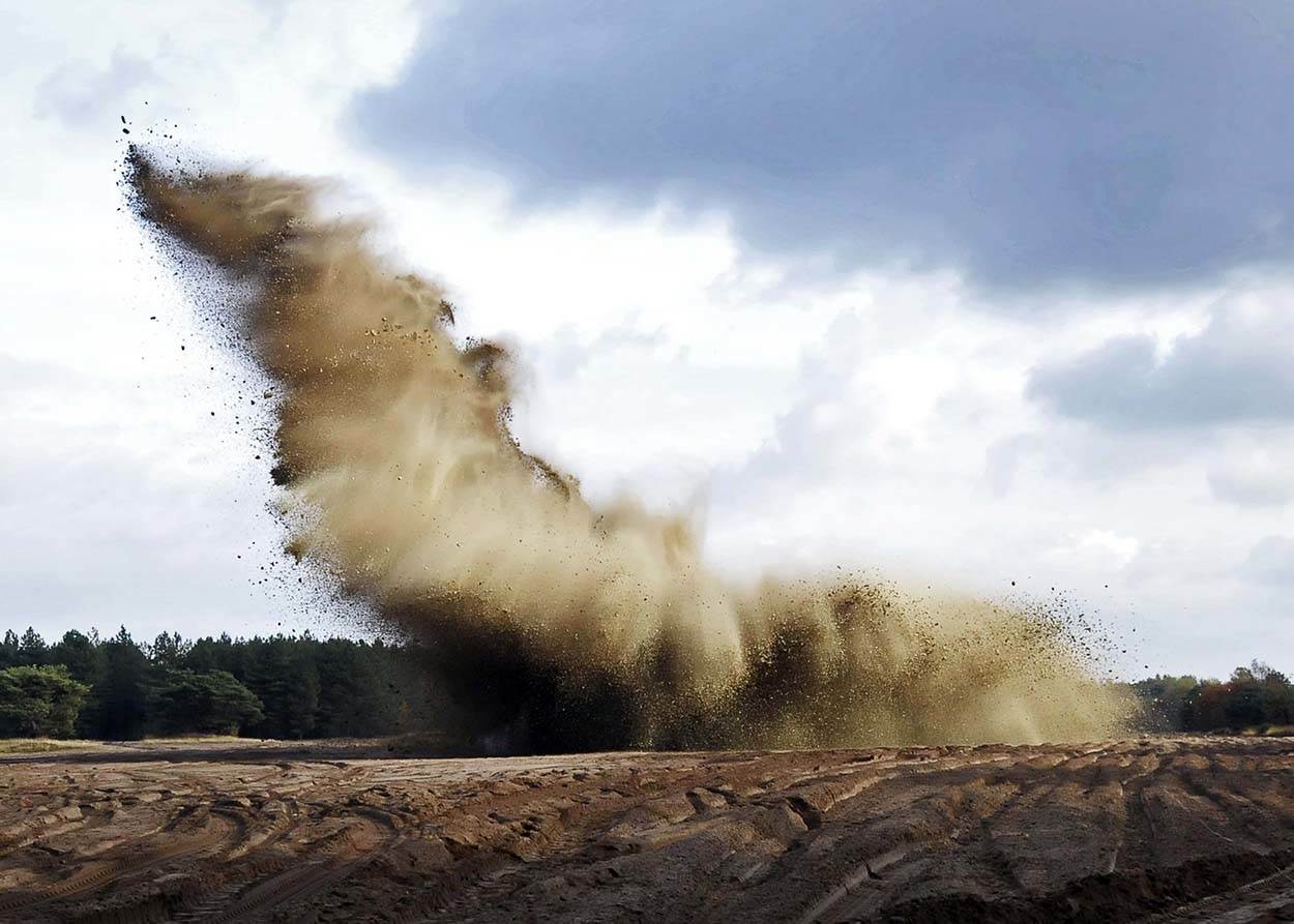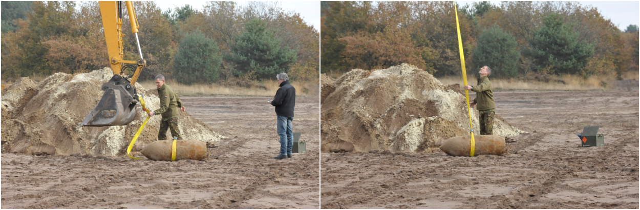 Als de rook is opgetrokken, is te zien hoe de bom een diep gat in de grond heeft achtergelaten. Een graafwerker gaat direct aan de slag om het weer netjes te dichten. Tussen stukjes verbrande zandgrond liggen flinke scherven. “Pas op, die zijn nog hartstikke heet,” waarschuwt de adjudant als nieuwsgierigen ze willen oprapen. Adjudant Eric is tevreden met de ontploffing. “Ik heb hem tegen de wand van de kuil gelegd, zodat de drukgolf een veilige richting opging en de scherven 1 kant opvlogen.” Die zijn inderdaad niet in de buurt van de toeschouwers terechtgekomen. De grootste stukken worden opgeruimd door de EOD, kleinere stukjes mogen als herinnering mee naar huis.