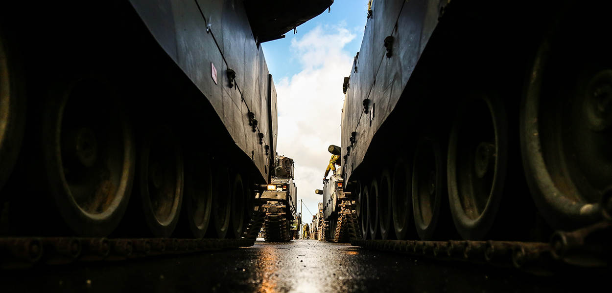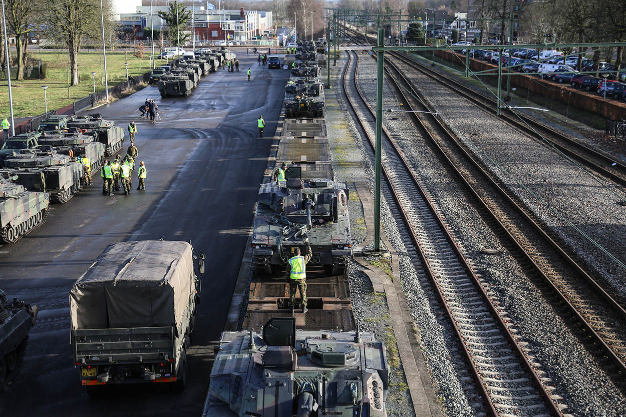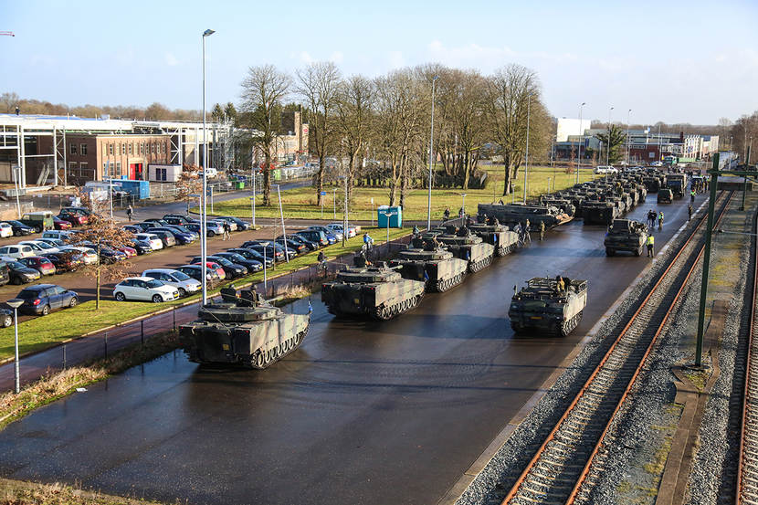Afgelopen donderdag kwam de eerste lading pantservoertuigen van 45 Pantserinfanteriebataljon Regiment Oranje Gelderland aan in Duitsland. Hier oefent het bataljon nog anderhalve week samen met 414 Tankbataljon voordat het weer per trein doorgaat naar Polen. De rest van de treinen gaat rechtstreeks naar Het Poolse Drawsko. Een reis van zo’n 36 tot 48 uur. “We hebben geen prioriteit op het spoor”, zegt Strijker. “Beetje bij beetje verplaatsen de wagons richting het oosten.” Vanaf het station hoeven de voertuigen geen lange weg over het asfalt af te leggen. “Ze rijden daar zo het oefenterrein op.”