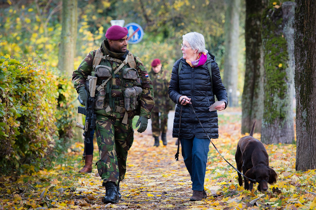 De inwoners van Geldermalsen zijn na een paar dagen gewend aan het ‘groen’ op straat. “Ik vind het wel een veilig gevoel”, zegt een oudere dame. “Jullie zijn hier altijd welkom. Oh ja, willen jullie soms koffie?”