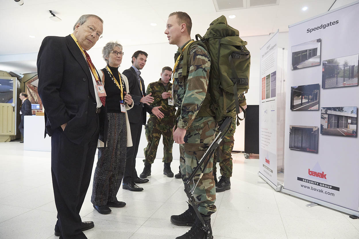 De kraam trekt ook de aandacht van generaal Middendorp. “Ik ben commandant geweest in Afghanistan en wij hadden dagelijks te maken met raket- en mortieraanvallen. Vormt zo’n groot object geen opvallend doelwit?” Het 2-laags systeem blijkt ook op de dreiging van inkomende mortieren het antwoord: “De buitenlaag moet werken als een trigger. Op de binnenlaag brengen we een laag aan die ook in scherfwerende vesten zit. Die moet de scherven opvangen.”