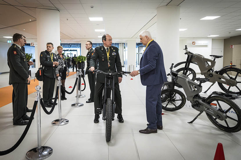 Naast vernieuwende toepassingen gericht op duurzaamheid, waren er ook meer tot de verbeelding sprekende innovaties te zien. Denk aan een ondersteunend exoskelet dat de draaglast voor militairen halveert. Ook een heuse fiets mocht op veel aandacht rekenen. De Trefecta is echter niet zomaar een tweewieler. Met 6 van deze ‘special forces-fietsen’ kunnen militairen in Mali patrouilles uitvoeren. Met het futuristisch ogende ‘onverwoestbare’ vervoersmiddel halen volledig bepakte militairen (160 kilo in totaal) snelheden tot boven de 70 kilometer per uur. Elektrisch ondersteund houden ze dit dan 100 kilometer vol.